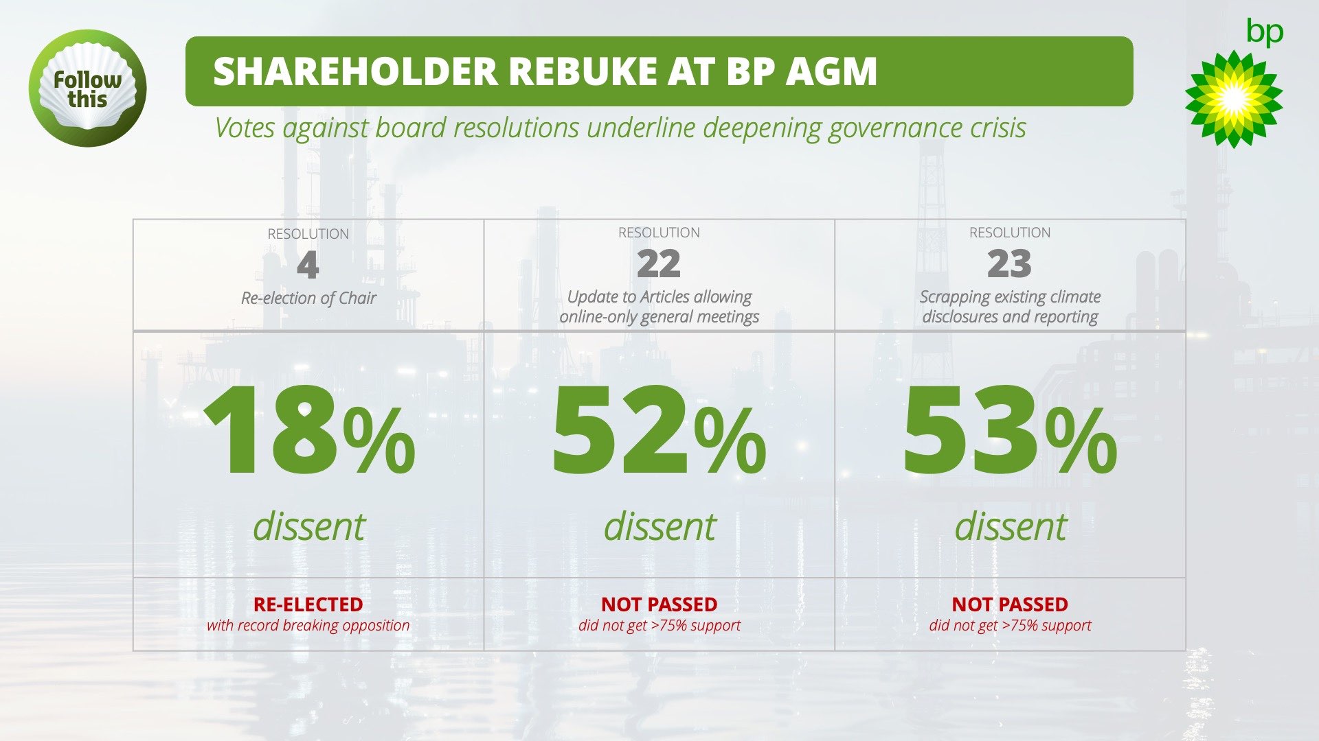 Follow This en de mede-indienende institutionele beleggers hadden alle aandeelhouders opgeroepen om tegen de bestuursresoluties te stemmen in een open brief aan het bestuur, nadat BP had geweigerd hun voorstel in stemming te brengen.