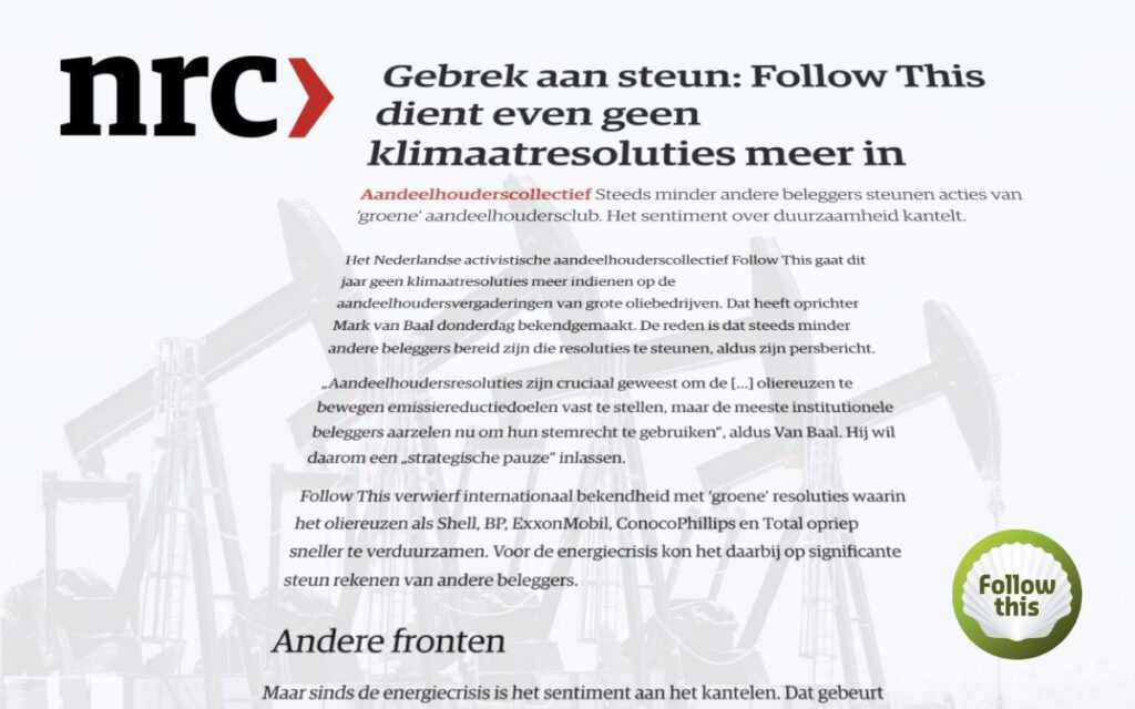 Follow This pauzeert klimaatresoluties bij oliemaatschappijen wegens afnemende beleggerssteun. Dit door politieke druk en focus op rendement na de energiecrisis, vooral in de VS.
