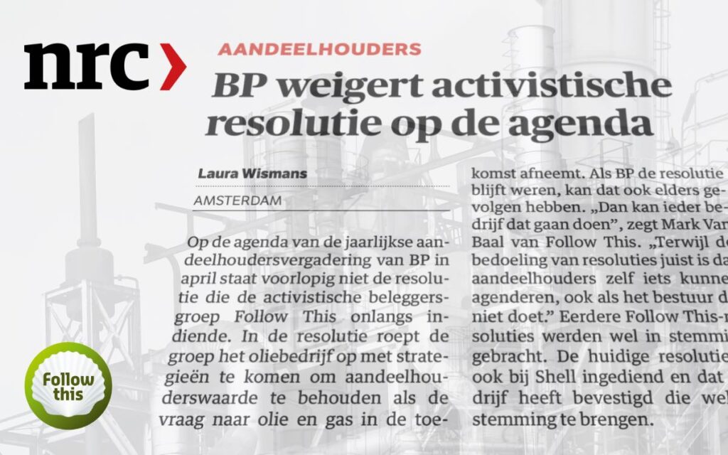 BP weigert een resolutie van Follow This op de agenda te zetten, terwijl Shell dat wel doet. Een gang naar de rechter is niet uitgesloten.