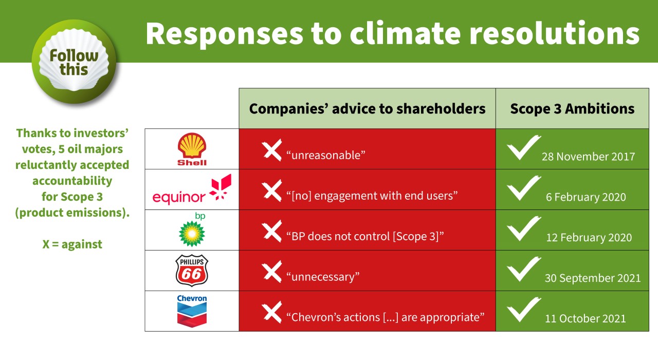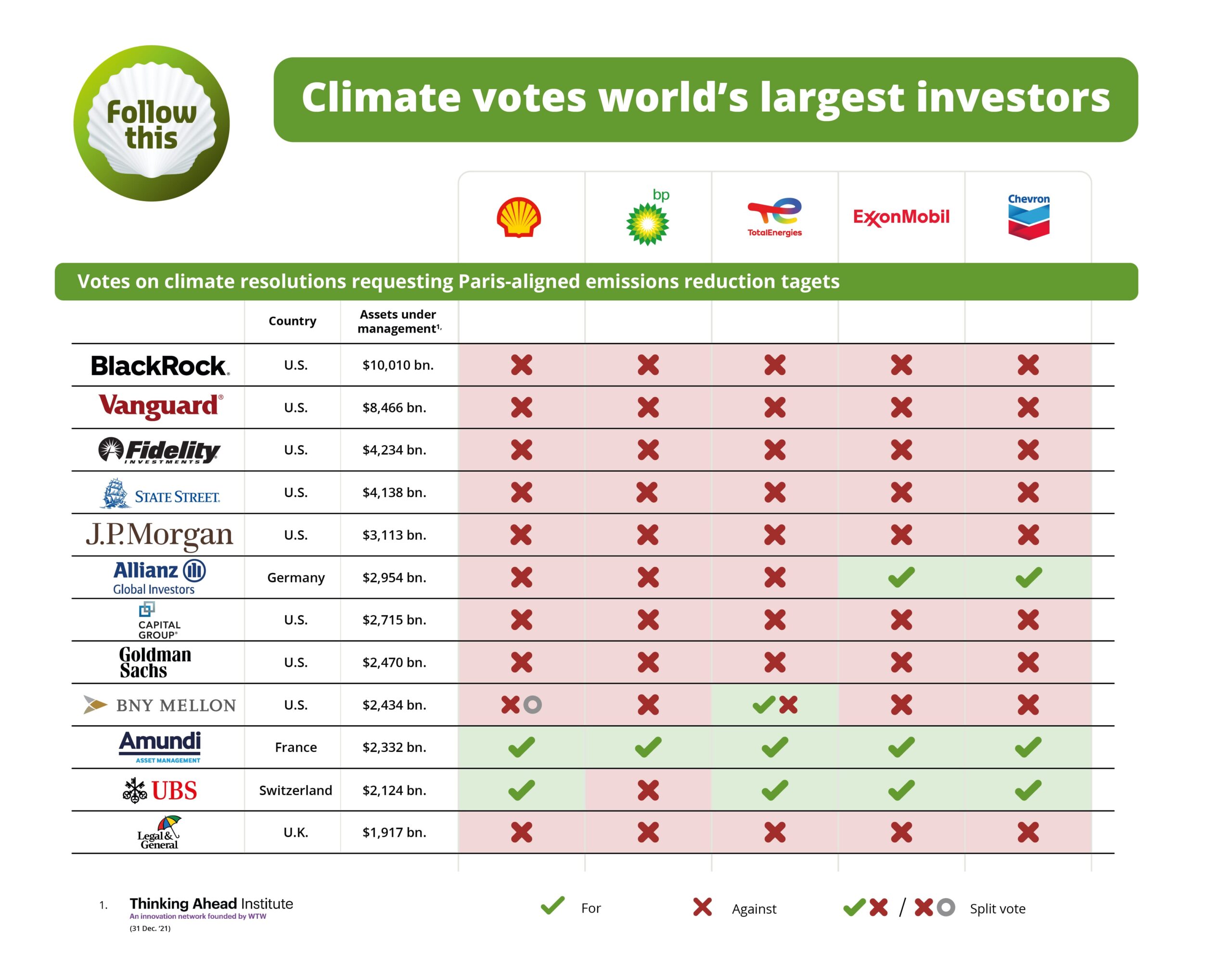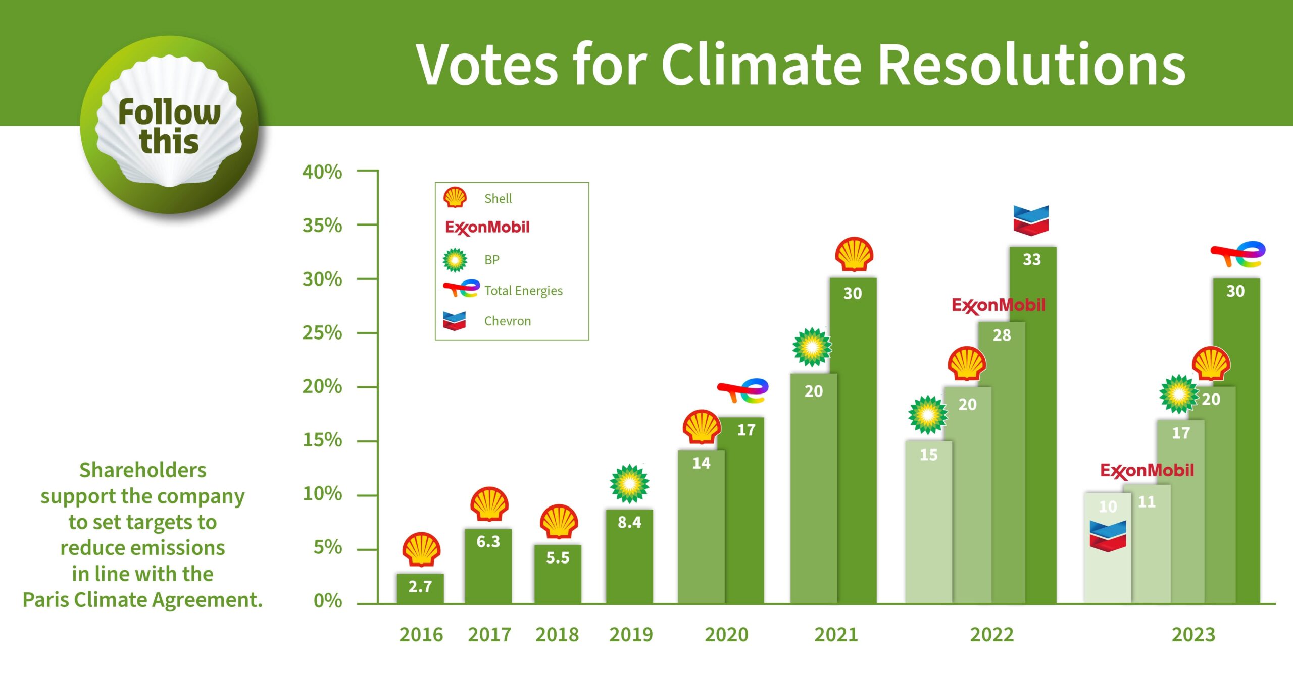 Follow This files climate resolutions, urging major oil companies to adopt Paris-aligned climate targets. Here are some of the results: